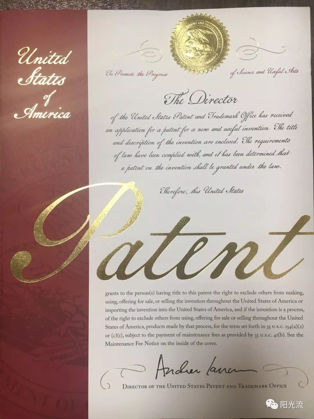收到美国专利商标局寄来的发明专利证书