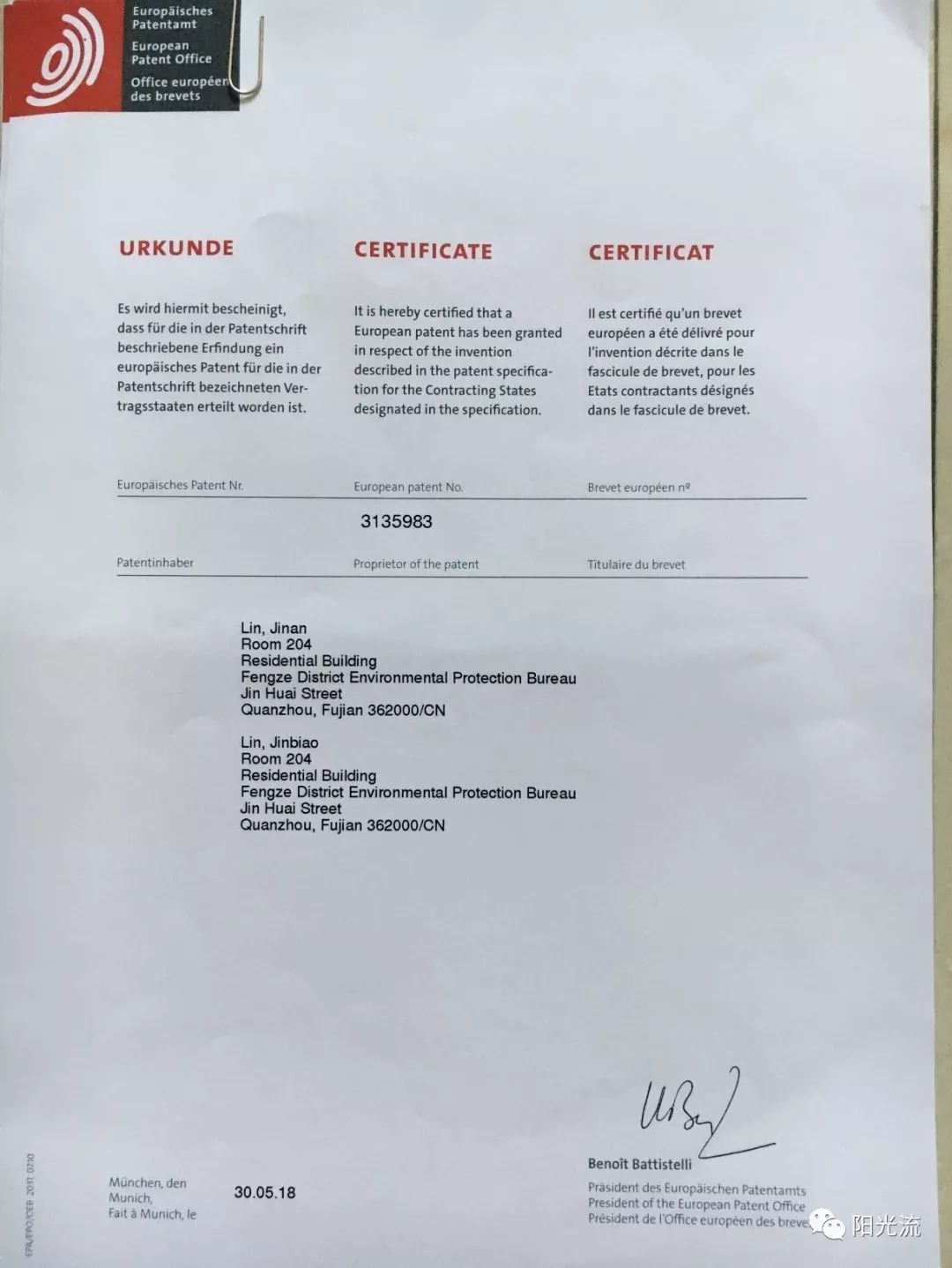 收到欧洲专利局寄来的欧洲发明专利证书