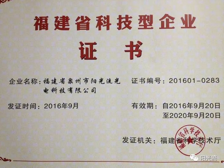 阳光流公司荣获福建省科技型企业证书
