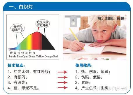 6、显色性低,会产生明显的色差,视觉系统对颜色的环境长时间处于失真状态,易疲劳、累。 这些副作用会使眼部免疫力下降,出现酸涩、疼痛、眩晕等症状,表现为精力不易集中,时间稍微长一点,出现疲劳,双眼很累,心情不耐烦,烦躁并易发脾气。诱发近视的几率也就大大提高。影响到孩子的学习效率和质量,也影响孩子的健康成长。因此,台灯不同于一般的照明灯具,由于其使用者主要为学生(青少年),且距离人体头部很近、使用时间相对较长,台灯普遍存在的频闪、辐射、强光谱线、紫外线、红外线、蓝光溢出、低显色性问题不容忽视!
