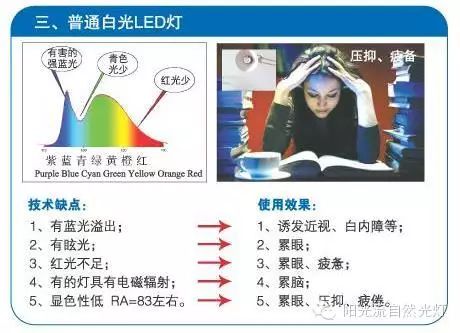 5、蓝光溢出的危害:普通白光LED灯具均存在蓝光溢出,也称强蓝光,这是因为普通白光LED的发光原来无法克服的,是与生俱来的,即普通白光LED芯片发出的光就是蓝光,经加黄色涂层形成的,因而蓝光溢出异常明显,对眼睛同样有伤害。