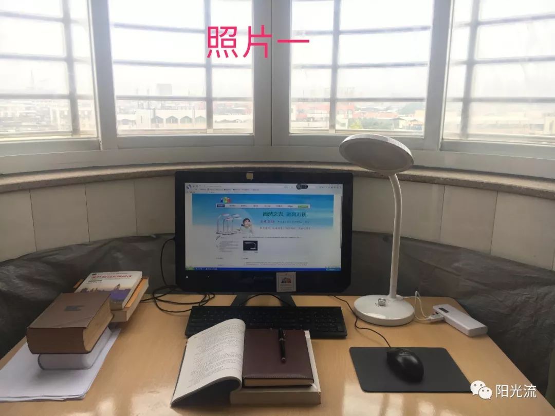 3、晚上或阴天时,把“阳光流自然光型”护眼台灯放在电脑屏幕的左侧或右侧(如:照片二),也可以放在电脑屏幕的上方(如:照片三);