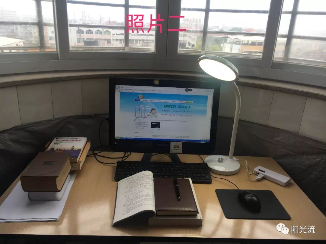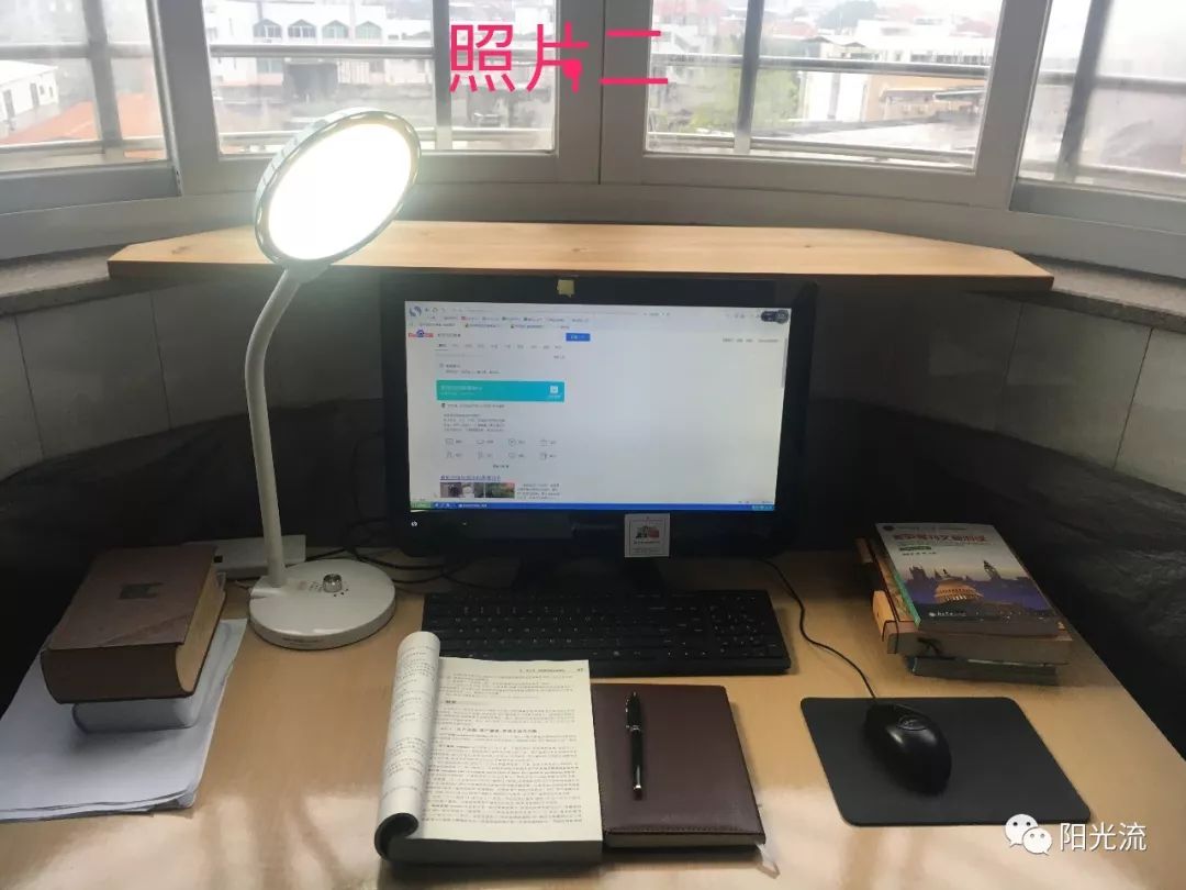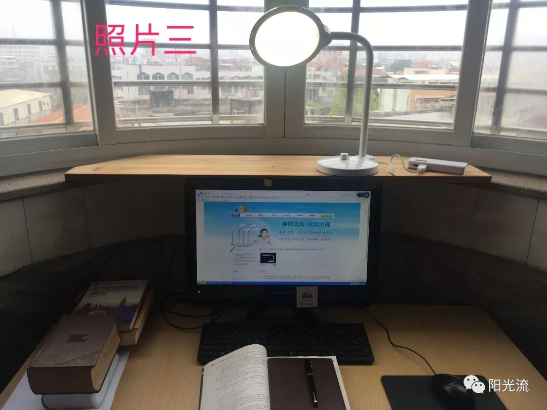 3、晚上或阴天时,把“阳光流自然光型”护眼台灯放在电脑屏幕的左侧或右侧(如:照片二),也可以放在电脑屏幕的上方(如:照片三);